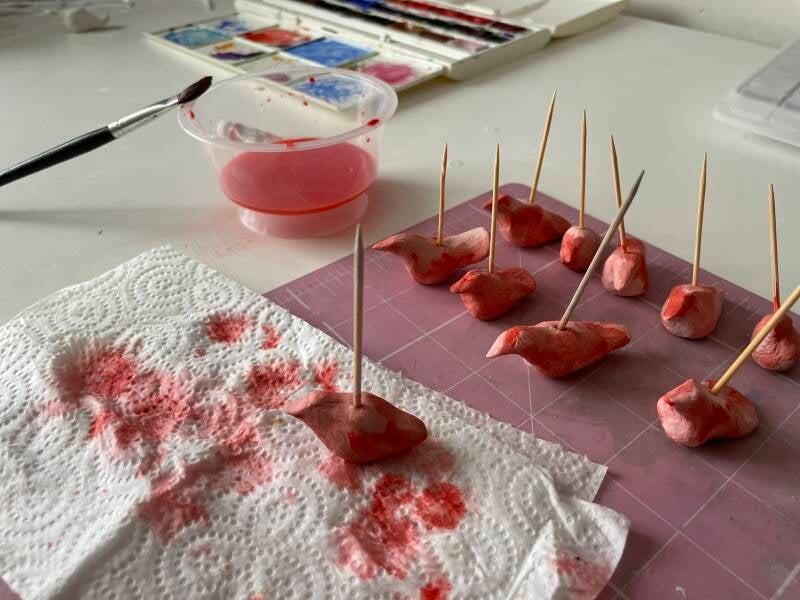 During the making of the project, I experienced a range of unexpected emotions, the birds whispered to me during the creative process and spoke of their plight, the red paint process was particularly gruelling and emotional. The making of each bird invited contemplation, my hands on the clay, shaping and responding, the energy somehow supporting the cause. I wept for the birds, for all birds and their treatment at the hands of humans.